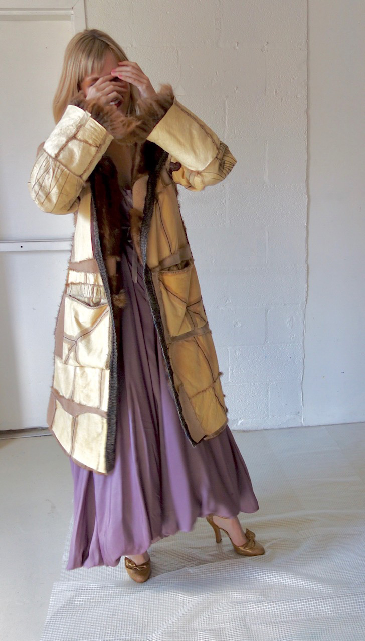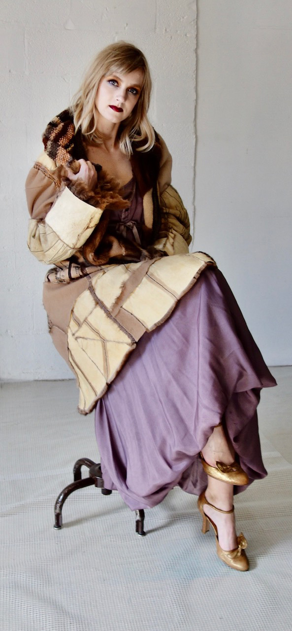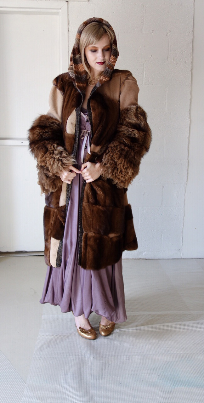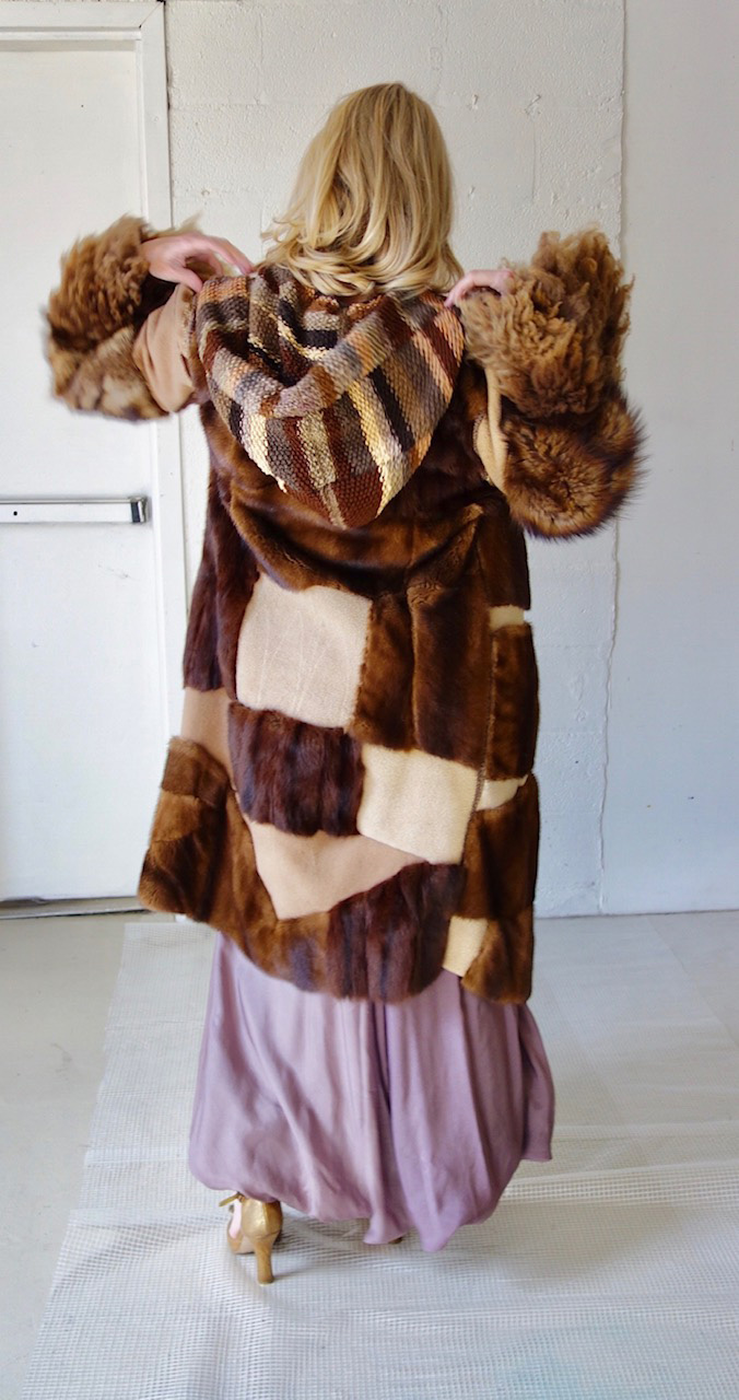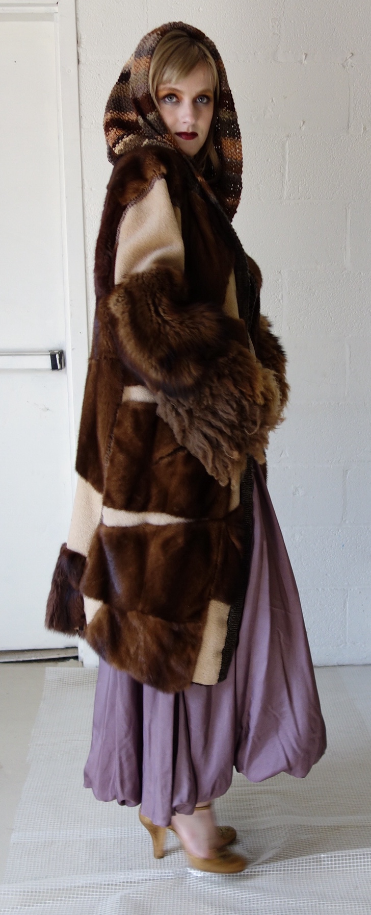 In 2018, another e-mail resulted from the September issue of Wag Magazine. Sonia had a Fendi mink from the 1980’s that was in terrible condition. I advised her against a redesign and a save. She insisted, so I mentioned that it would be necessary to cut it up into many pieces and create something wild. I combined her salvaged pieces of mink with sable, lamb, fox and boiled wool coating. I designed the hood, which was knit according to a sketch. It resulted in a flipping fur design using the pieces from the Fendi. It is also reversible.