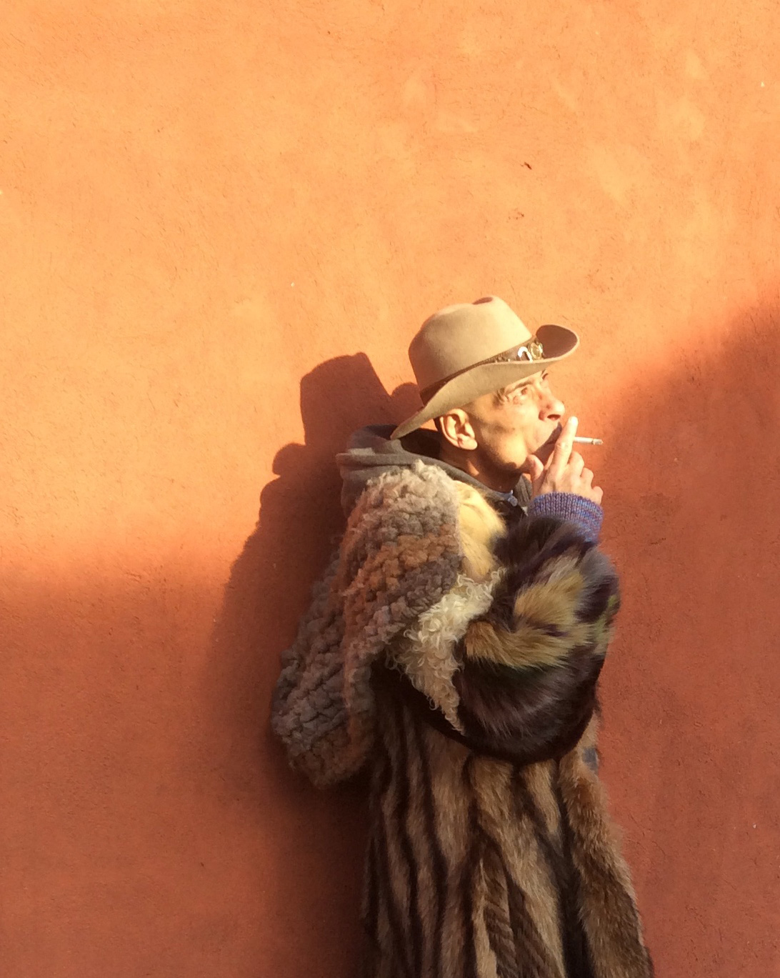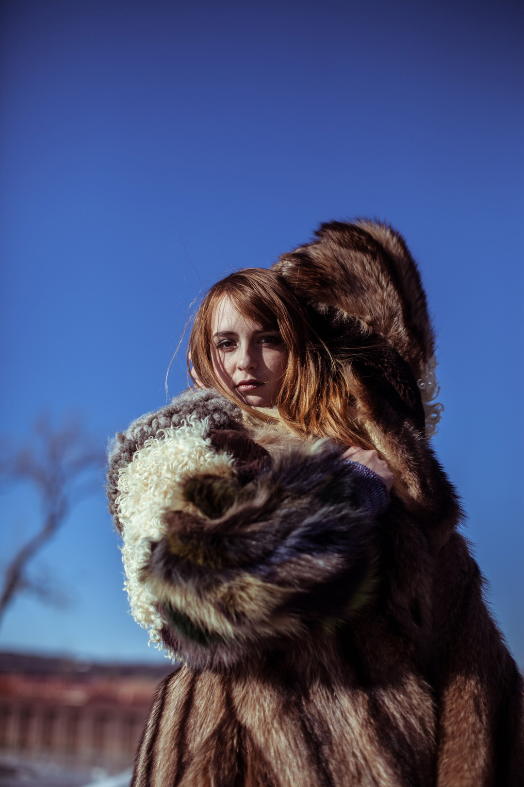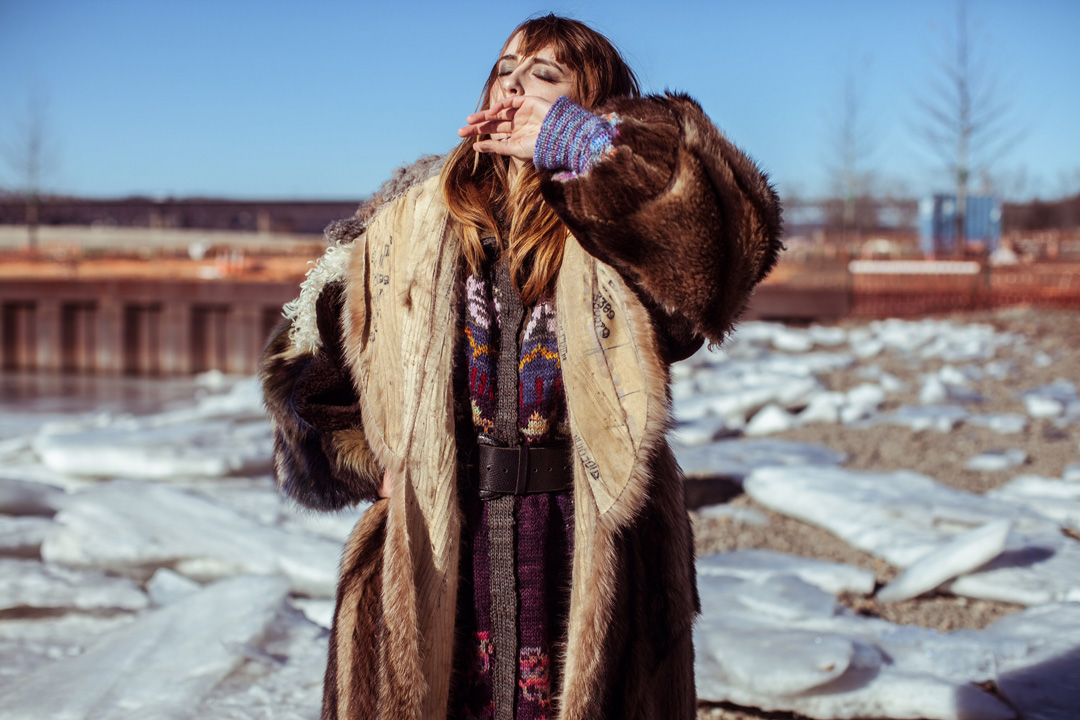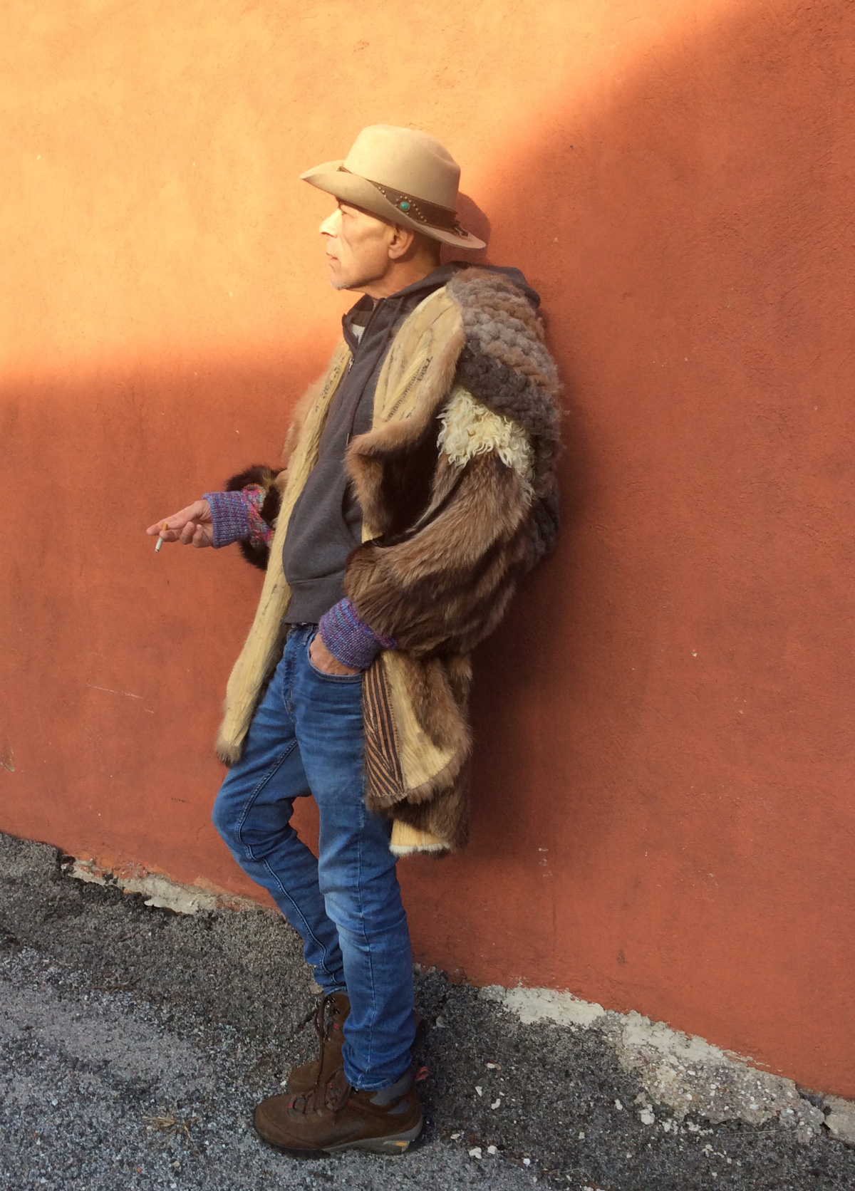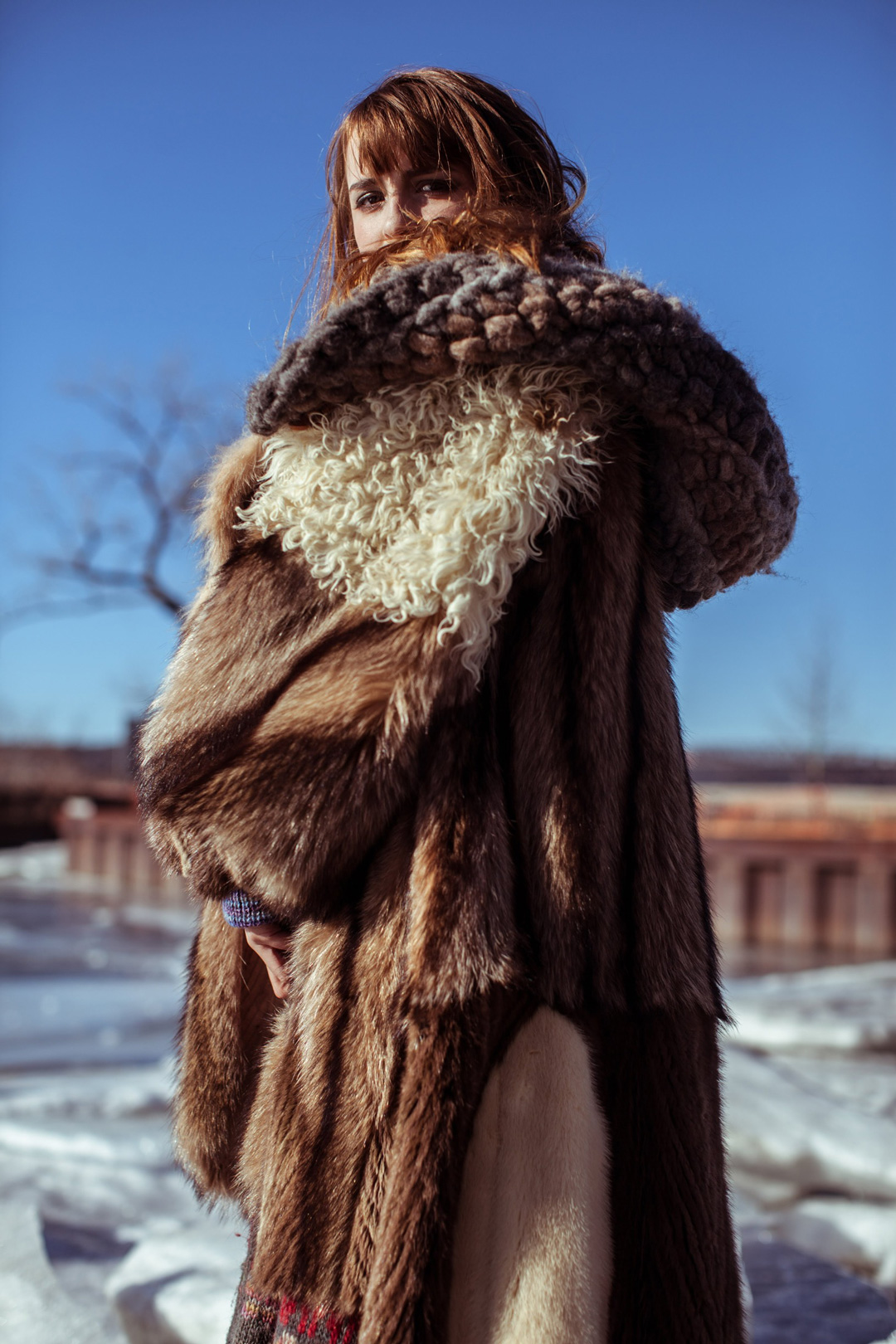 Naomi presented me with two furs that were in very poor condition. I had a considerable amount of scraps left from recent commissions. This was to be a puzzle coat and a freedom of design coat. The hood is crocheted alpaca roving. The cuffs are knit with alpaca. The alpaca was acquired from a local farm. The coat is rustic, rich in character and reversible.