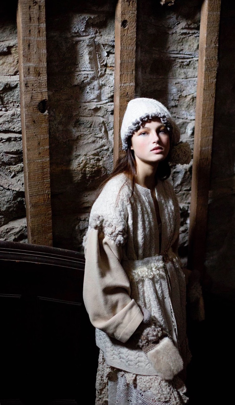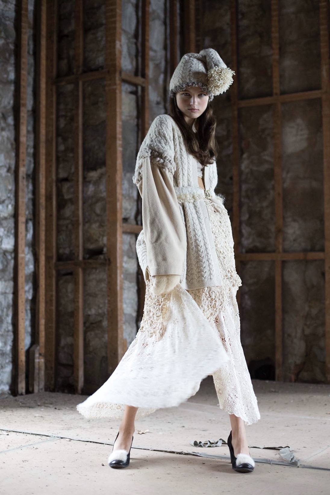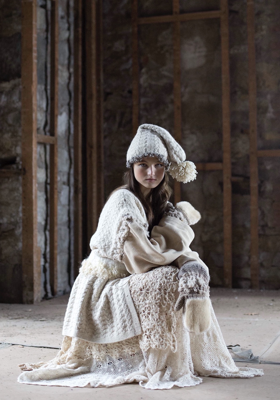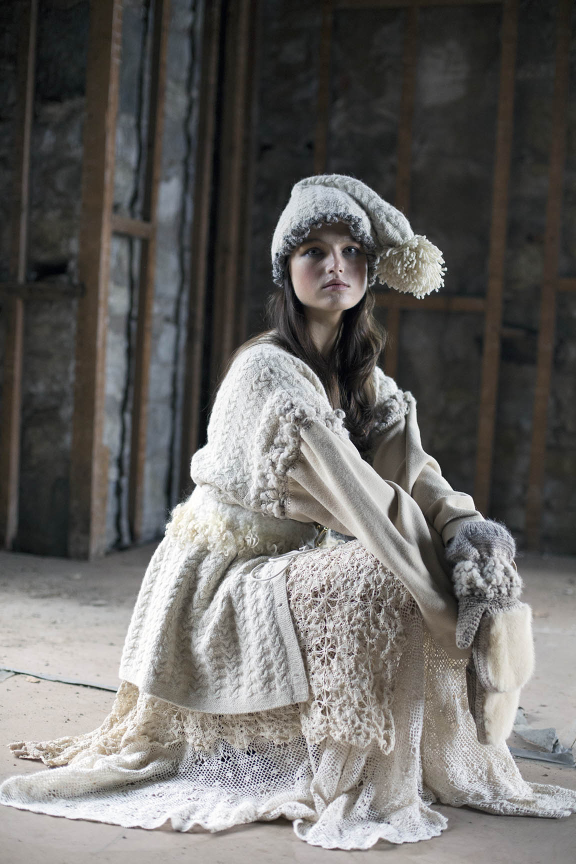 A deconstructed alpaca sweater and a pair of cashmere sleeves, from reworking a jacket, were combined to create a more interesting design. This further inspired the hat, the gloves, the belt ( New York Textile Labs ) and even the shoes.