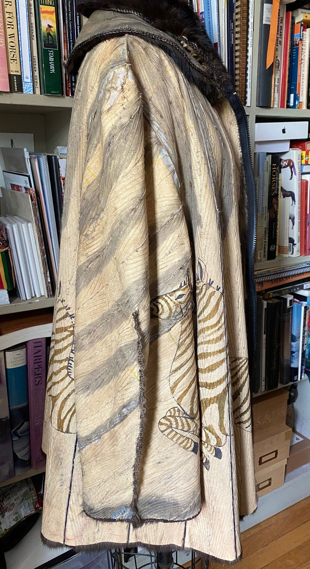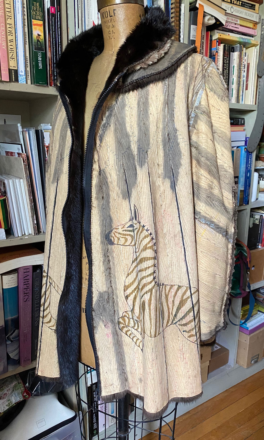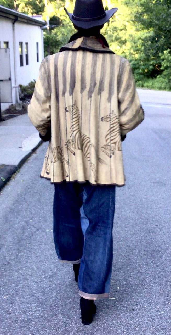 The skin side is illustrated with Zebras, while the dark mink side can be worn for it’s original purpose, pure luxury.