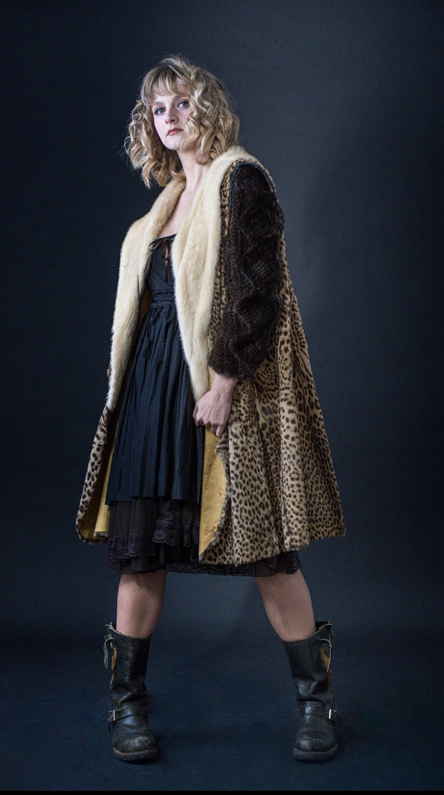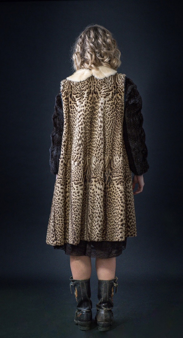 This combo is two pieces that can be worn in multiple ways. As a result of the article in Wag Magazine, I was contacted by a woman who liked my flipping fur objective. The leopard coat was donated as a result. It had been made by her grandmother who was a tailor and worn by both she and her mother. Her story linked to mine.